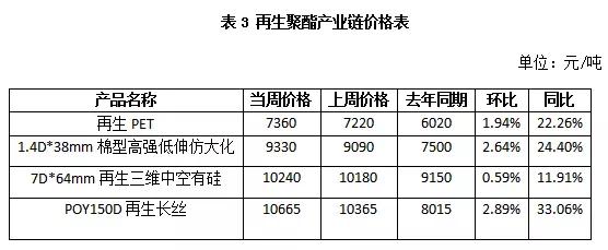 本周再生PET市場繼續(xù)上行,價(jià)格刷新年內(nèi)高點(diǎn)。截至收盤,華東市場仿大化白片未含增值稅價(jià)格在7400元/噸,較上周上漲100元/噸,漲幅在1.36%。